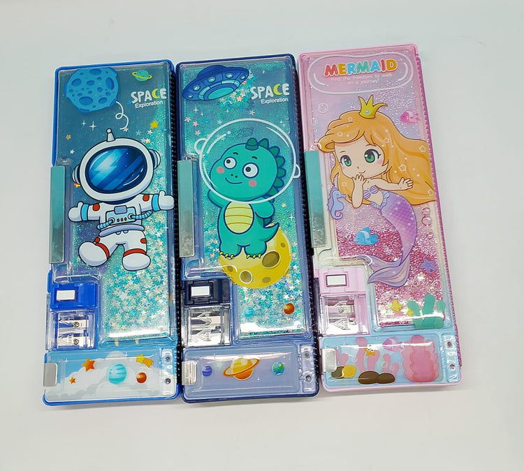 Discover the perfect storage solution for your school supplies with our Blue Space Print Geometry Box! This durable pencil box features three spacious compartments and a built-in sharpener. Keep your pencils, pens, and other essentials organized for maximum productivity. Plus, there is an additional small compartment for extra convenience.